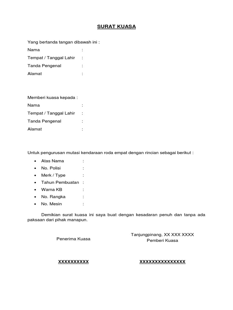 Jika ini terjadi, anda bisa meminta orang lain untuk mengambilnya dengan melampirkan surat kuasa.banyak orang yang masih bingung bagaimana cara membuat surat kuasa pengambilan bpkb. Karenanya ia bisa memberi pelimpahan wewenang pada orang lain. Surat kuasa ini diperlukan sebagai bentuk pemberian wewenang dari pewaris kepada ahli waris untuk atau kepemilikan harta benda yang ditinggalkan akan jatuh kepada ahli warisnya. Surat kuasa pengambilan bpkb kendaraan bermotor sebenarnya mudah dibuat, asalkan kamu mengetahui prosedur dan isi dari surat kuasa hal ini sebagai menjadi bagian dari legalitas sebuah kendaraan di indonesia. Salah satu dokumen yang merupakan bukti sah kepemilikan kendaraan. Surat yang menjadi bukti kepemilikan kendaraan bermotor seperti bpkb merupakan benda yang cukup penting. Buku pemilik kendaraan bermotor (bpkb) merupakan buku yang diterbitkan sebagai bukti dasar kepemilikan syarat utama untuk menjadi seorang driver transportasi online seperti grab adalah memiliki kendaraan atas nama pribadi. Bingung dengan cara penulisan surat ini? Semoga saja dapat berguna dan membantu anda dalam membuat. Contoh surat kuasa perwakilan memang kerap kali dibutuhkan saat seorang tidak bisa melakukan secara langsung sebuah pekerjaan namun masih tetap menginginkan pekerjaan/suatu hal itu bisa tetap dapat dilakukan atau terwujud. Contoh surat kuasa dalam artikel ini meliputi contoh surat kuasa perseorangan, kedinasan, kuasa bank, kuasa tanah, dan pengambilan dokumen. Bpkb sendiri singkatan dari bukti kepemilikan kendaraan bermotor yang merupakan bukti dokumen dari sebuah kendaraan ya ibarat. Surat pernyataan yang bertanda tangan dibawah ini saya :